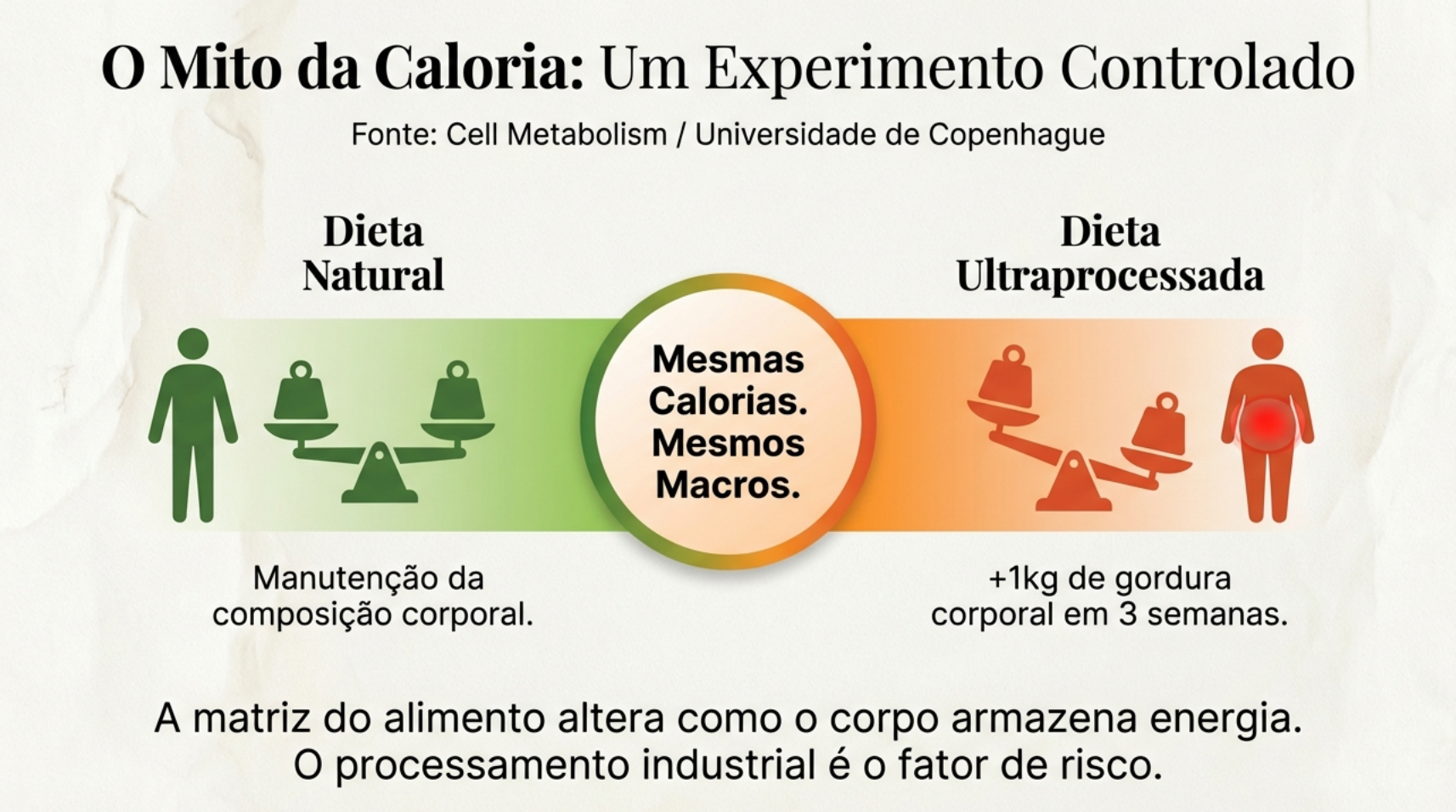 A ciência atual prova isso com crueldade. Um estudo recente da Universidade de Copenhague mostrou que homens jovens consumindo ultraprocessados ganharam 1kg de gordura pura em apenas três semanas, ingerindo exatamente a mesma quantidade de calorias que o grupo que comeu comida in natura.