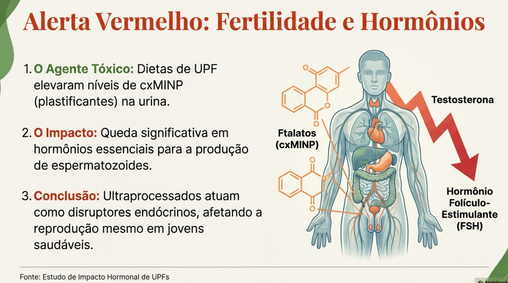 E fica pior. Estamos literalmente comendo plástico. O contato dos alimentos com máquinas industriais e embalagens plásticas libera ftalatos (como o cxMINP). Um estudo dinamarquês associou isso diretamente à queda drástica de testosterona e fertilidade.