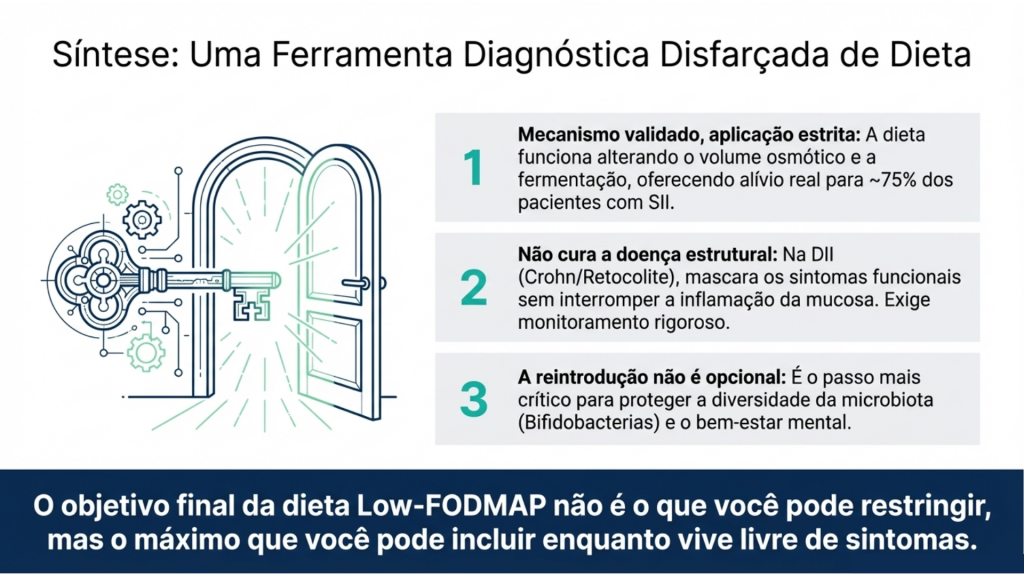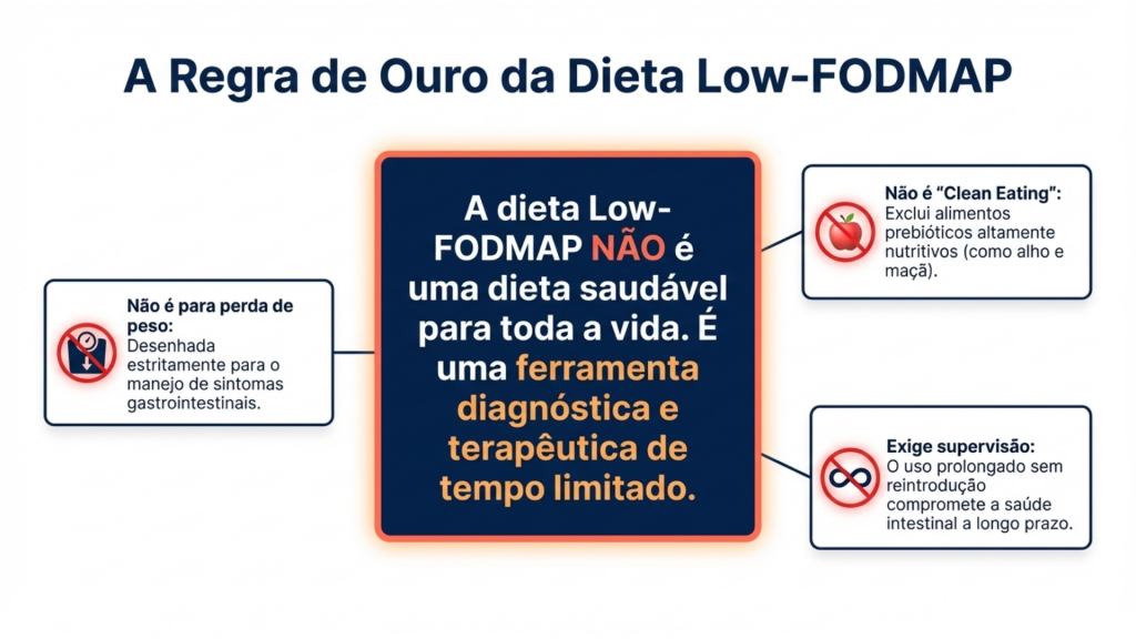 Existe um paradoxo perigoso aqui. Ao cortar os FODMAPs, você silencia a dor rapidamente, mas também corta o alimento das bactérias boas do seu intestino (como as Bifidobactérias).