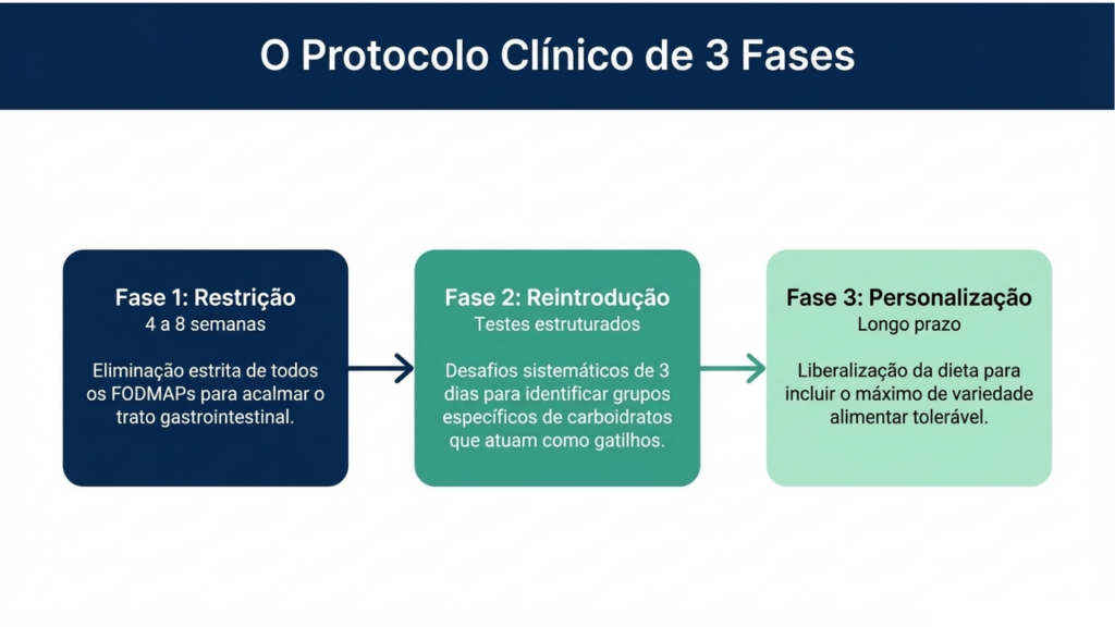 • Fase 2 – Reintrodução Sistemática: Testamos gradualmente cada grupo de carboidrato (como a lactose e a frutose) para descobrir exatamente qual é o seu gatilho e qual a quantidade que o seu corpo tolera.