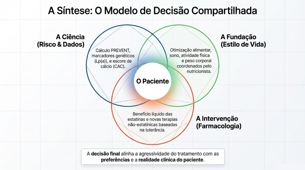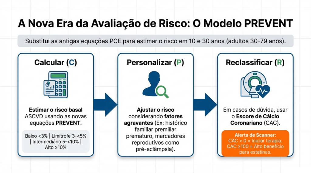 - P – Personalizar: Analisar fatores que a calculadora não vê, como histórico familiar precoce ou doenças inflamatórias.
