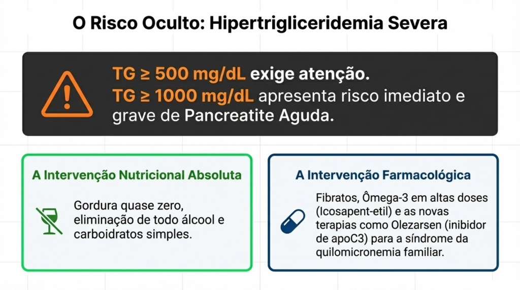 - Triglicerídeos ≥ 1000 mg/dL: Recomendação forte para um plano individualizado visando evitar a pancreatite aguda.